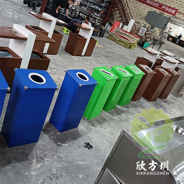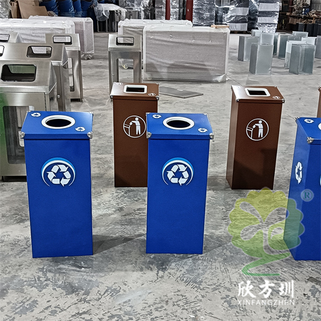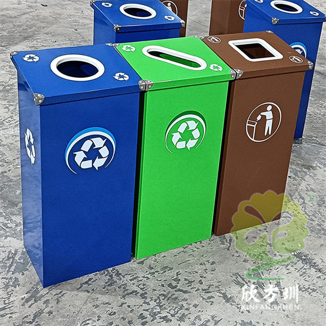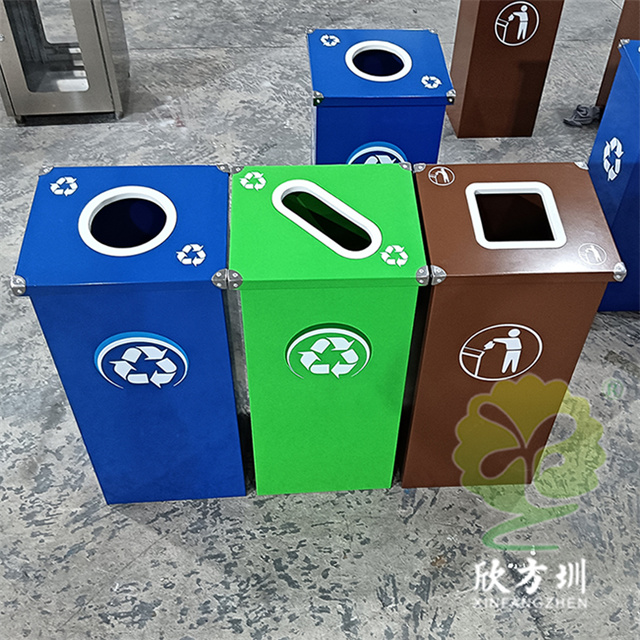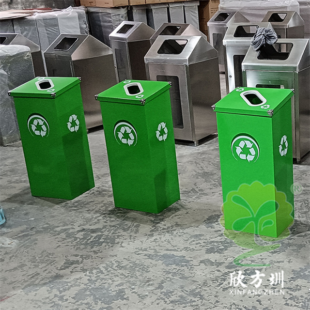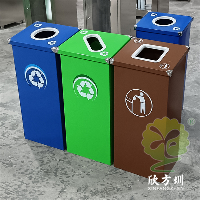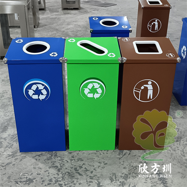 廣東烤漆三色不鏽鋼(gāng)91蝌蚪九色垃圾桶投放點可以(yǐ)采用鍍鋅板、201/304不鏽(xiù)鋼製造,方形組合式立式直投口設(shè)計,噴粉烤漆綠色、藍色和咖啡色,投口圓形、橢圓形、方形開口,蓋子四角帶鉚釘裝飾,可(kě)以做固定支架,桶身正麵和(hé)投口邊可以定製油墨絲網印刷中英文標識和人頭標。