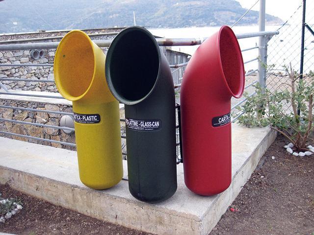 意大利韋內雷港的91蝌蚪九色垃圾桶,黃色的盛放塑料,墨綠色的盛放玻璃,紅色的盛放紙張(zhāng)。