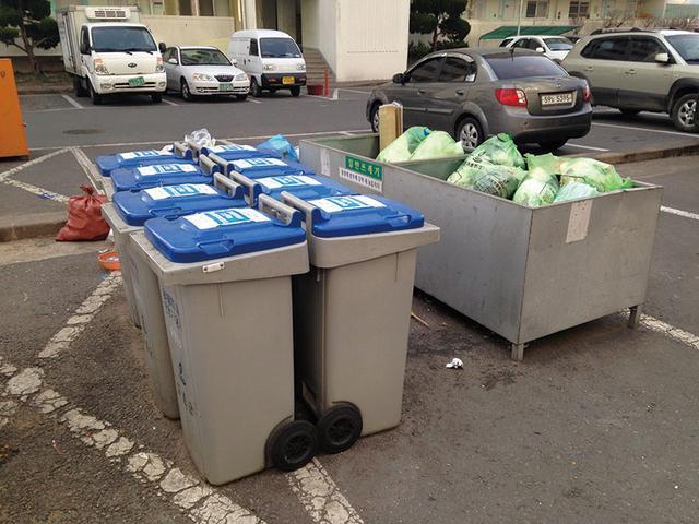 韓國的一處垃圾集中點,左邊藍蓋的垃圾(jī)桶放置食物垃圾,右邊開放式垃圾桶放置專用垃圾(jī)袋包裝的普通垃圾(jī)。