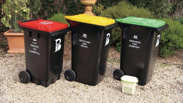 澳大利亞南部城市伯恩賽德居民區的三色(sè)垃圾桶,分別盛放普通生(shēng)活垃圾、可回收(shōu)垃(lā)圾(jī)和(hé)可堆肥的有機垃圾。