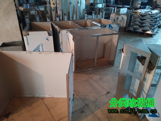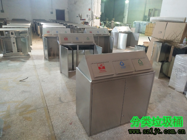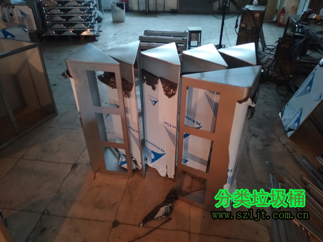 小區物業不(bú)鏽鋼三91蝌蚪九色垃圾桶生產組裝圖片: