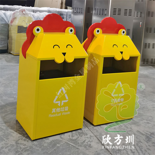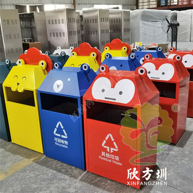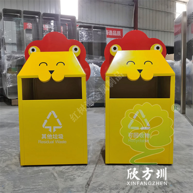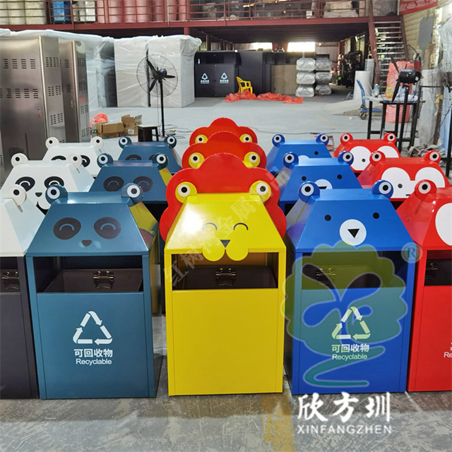 動物卡通造(zào)型彩色不鏽鋼91蝌蚪九色垃圾桶采用了1.00mm厚的304不鏽鋼板製造而成,戶(hù)外方形彩色動物造型設計,每個垃圾桶擁有不同的動物造型,有猴子(zǐ)、獅子、熊貓等造型,桶身表麵噴塗噴塑了紅色、藍色、黃色、深綠色(sè)、黑(hēi)色,背麵帶垃(lā)圾桶門板可以使用三(sān)角鑰匙開門取出(chū)內筒,正麵絲印(yìn)了最新國標91蝌蚪九色(lèi)標識。