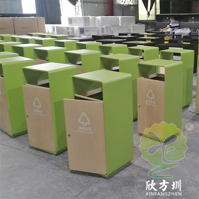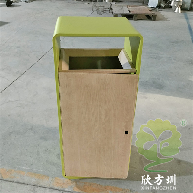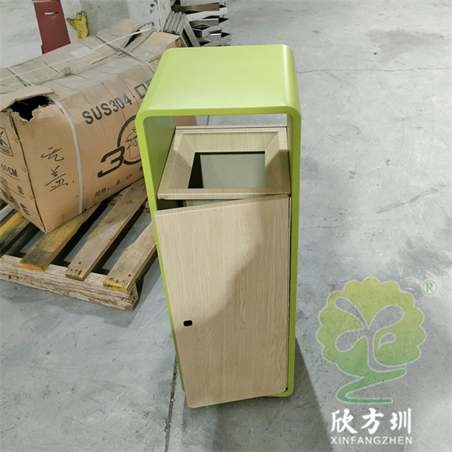 室內戶外轉木紋方形不鏽鋼垃圾(jī)桶采用了304不鏽鋼板(bǎn)製造(zào)而(ér)成,方形雙(shuāng)麵投口單(dān)筒設計,桶身框架采用了淡綠色噴塗(tú)噴塑上色(sè),框架板材雙層折彎(wān)更佳耐用,桶身雙麵門板采用了(le)轉木紋工藝製作,內筒可以使用三角鑰匙打開門板取出內置(zhì)的內筒,正反麵(miàn)絲網印刷了白色的其他垃圾最新國標,可以定製雙91蝌蚪九色或者多91蝌蚪九色的桶。