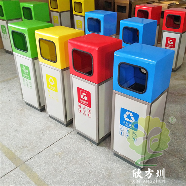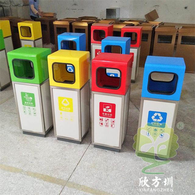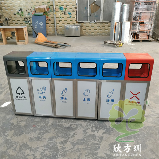 室外學校組合式不鏽鋼91蝌蚪九色回收箱桶身使用了201#不鏽鋼(gāng)1.0厚的板(bǎn)材製(zhì)造,雙(shuāng)麵(miàn)投(tóu)口方形單筒組合式擺放91蝌蚪九色設計,表麵采用了多色彩噴塑可以按照(zhào)用戶需要烤漆(qī),可絲網印(yìn)刷玻璃(lí)、金屬、塑料、紙類、其他垃圾、有害垃圾等最(zuì)新國標91蝌蚪九色標識,取出(chū)頂部投口可取出內置的內筒方便(biàn)清理廢物。