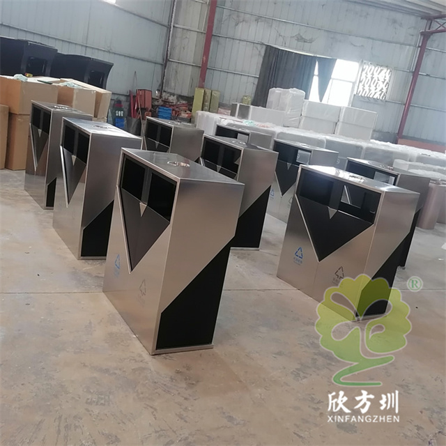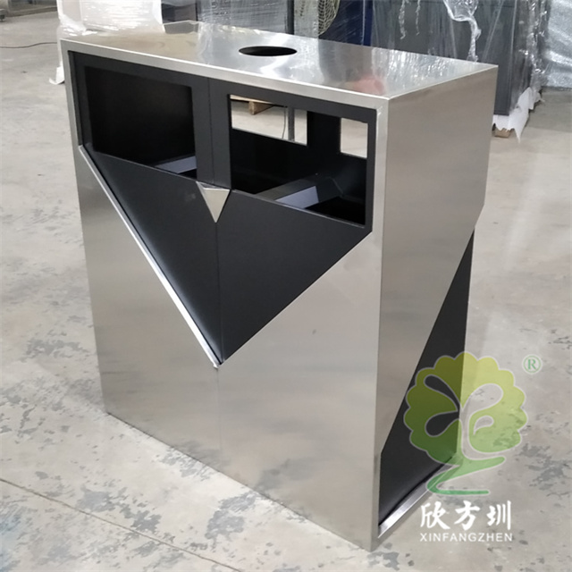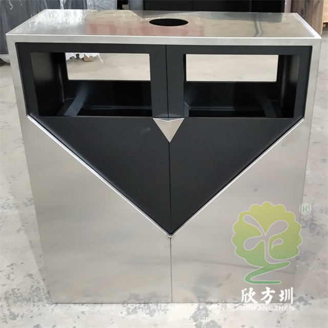 戶外小區噴塑不鏽鋼91蝌蚪九色垃圾桶采用了304不鏽鋼板1.0mm製(zhì)造而成,室(shì)外兩連體方形設計,創意框架雙層雙(shuāng)層不鏽鋼,內側不鏽鋼黑色(sè)噴(pēn)粉,頂部帶個煙灰盅,背麵三角鑰匙雙開門可以取出內筒,正麵絲印單色國標91蝌蚪九色標識。