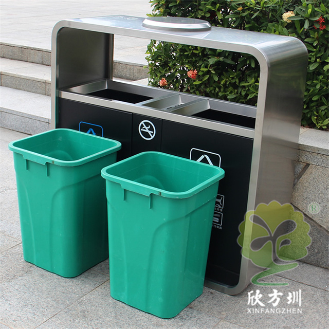 戶外市政街道不鏽鋼91蝌蚪九色垃圾桶可以采用201不鏽鋼或者304不鏽(xiù)鋼板製造,頂部中心位置凸起出是這款桶創意方形兩連體設計,正反麵油墨絲網印刷最新國標分(fèn)類標(biāo)識和禁煙(yān)標識,側麵可以定製絲印企業logo,垃圾桶兩個方形投口中間位置帶滅煙盒,帶三角(jiǎo)鑰(yào)匙開門方(fāng)便環衛工人清理內置廢物。