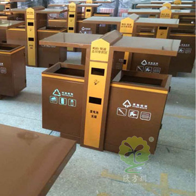 鋼板仿木公(gōng)園垃(lā)圾桶采用優質冷軋(zhá)鋼材料經激光切(qiē)割剪鈑下料、折彎、衝壓、焊接、打磨、等工藝:表麵經過除油、噴砂防(fáng)鏽處理後(hòu),再進行酸洗磷化處理;表麵清理幹燥後整體進行靜電噴塗或烤漆處理,靜電噴塗(tú)是經過(guò)流水線高溫固化爐固化後再出爐(lú)冷卻,加(jiā)工後的塑粉附著力強,不易剝落,這(zhè)樣戶外防鏽效果才會好。
