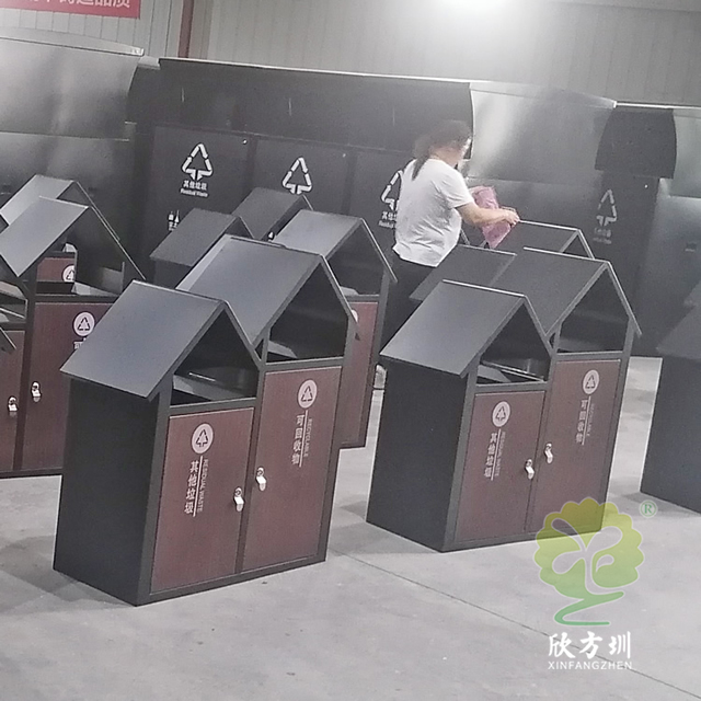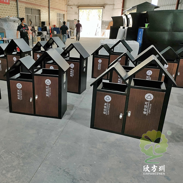 公園景區屋形91蝌蚪九色垃圾箱采用了全新優質1.0mm厚冷軋鋼板製造而成,兩91蝌蚪九色(lèi)連體尖(jiān)頂屋形設計,整(zhěng)體垃圾桶(tǒng)框架黑色噴塗噴(pēn)塑,正麵推拉門板(bǎn)仿轉木紋效果,門板(bǎn)油墨絲印了新國標其他(tā)垃圾、可回收物(wù)分(fèn)類標(biāo)識,三角鑰(yào)匙開門方便取出內置的內筒,可回收箱側麵上方帶一個滅煙盒。