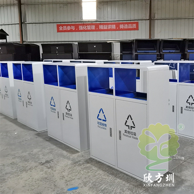 戶外方形烤漆(qī)白色鍍鋅板91蝌蚪九色垃圾桶采(cǎi)用了1.00mm厚的鍍鋅板製作而成,雙麵投口方形兩連(lián)體分(fèn)類(lèi)設計(jì)簡潔大氣,兩麵(miàn)絲網印刷了其他垃圾和其他垃圾的(de)最(zuì)新國標91蝌蚪九色標識,開門方式采用了磁吸方式推拉無需三角鑰匙, 我們廠家支持冷軋鋼板、不鏽鋼、表麵電鍍、烤漆、噴塑上色(sè)定製,每個城市(shì)都有(yǒu)每一個城市(shì)垃(lā)圾桶設計方案。